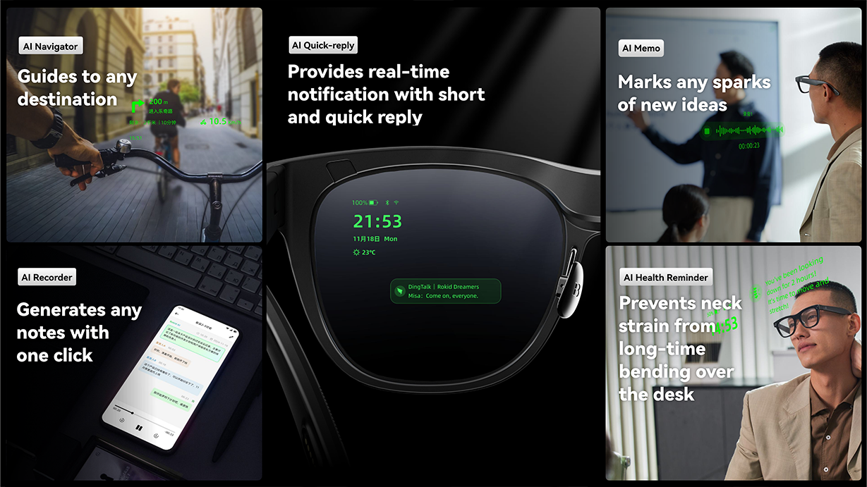 Rokid Ai Glasses put AI-powered information right in your line of sight. Get directions, translations, notifications, and answers instantly—without pulling out your phone. Everything works hands-free, so you stay focused on what matters. Lightweight, intuitive, and designed for everyday use, Rokid Ai Glasses fit seamlessly into work and life.