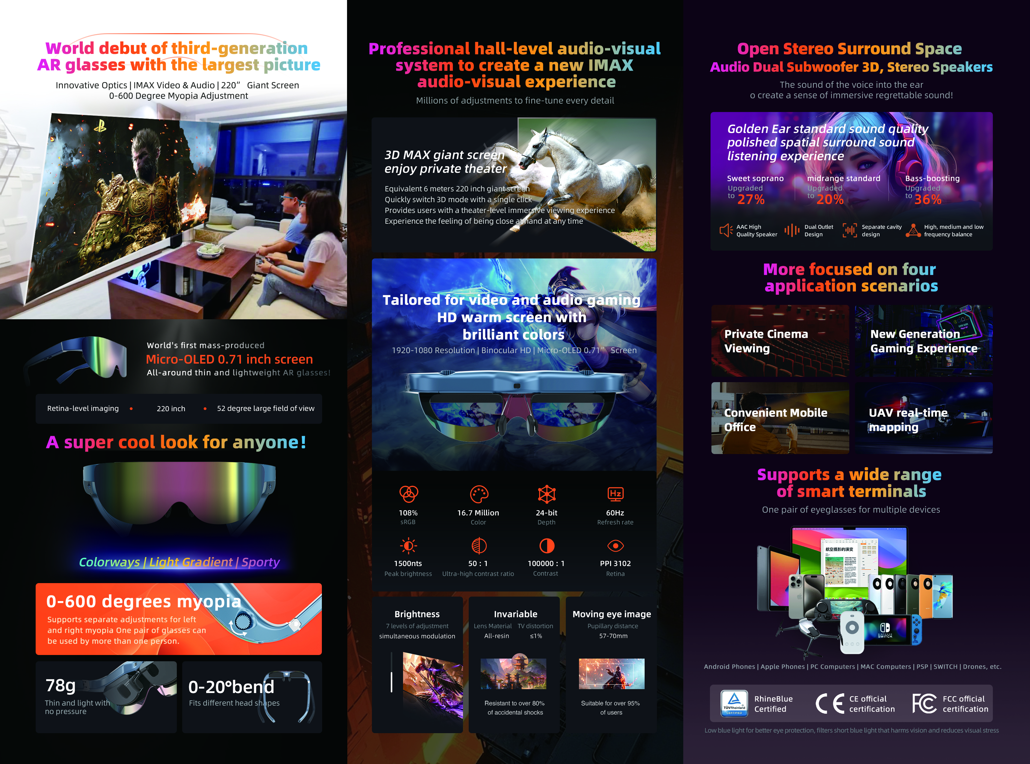 With a wide 52° field of view equivalent to a 220-inch virtual screen at 6 meters, adjustable 0–600° myopia correction, and TÜV Rheinland low blue light certification, the glasses ensure both comfort and eye protection. Powered by a quad-core Cortex-A55 processor, supporting 3DoF spatial interaction, wireless casting, and USB-C DP high-speed video input, these AR glasses are ideal for entertainment, productivity, and next-generation immersive applications.