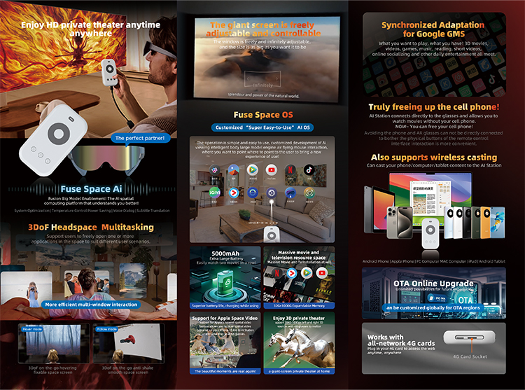With a wide 52° field of view equivalent to a 220-inch virtual screen at 6 meters, adjustable 0–600° myopia correction, and TÜV Rheinland low blue light certification, the glasses ensure both comfort and eye protection. Powered by a quad-core Cortex-A55 processor, supporting 3DoF spatial interaction, wireless casting, and USB-C DP high-speed video input, these AR glasses are ideal for entertainment, productivity, and next-generation immersive applications.